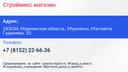 Строймикс, магазин по адресу 183034, Мурманская область, Мурманск, Магомета Гаджиева, 10 в дальнейшем Организация, размещена в следующих категориях: