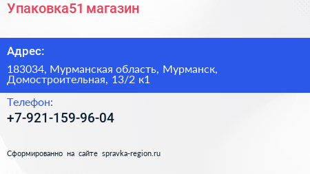 Упаковка51, магазин по адресу 183034, Мурманская область, Мурманск, Домостроительная, 13/2 к1 в дальнейшем Организация, размещена в следующих категориях: