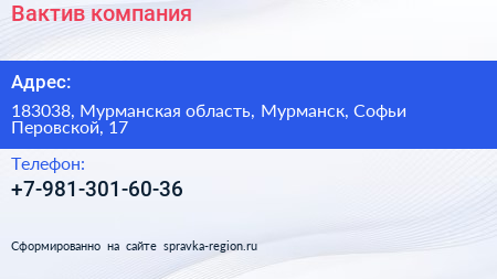 Вактив, компания по адресу 183038, Мурманская область, Мурманск, Софьи Перовской, 17 в дальнейшем Организация, размещена в следующих категориях: