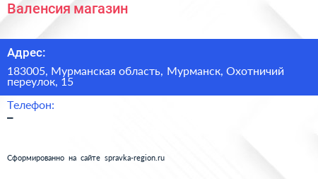 Валенсия, магазин по адресу 183005, Мурманская область, Мурманск, Охотничий переулок, 15 в дальнейшем Организация, размещена в следующих категориях: