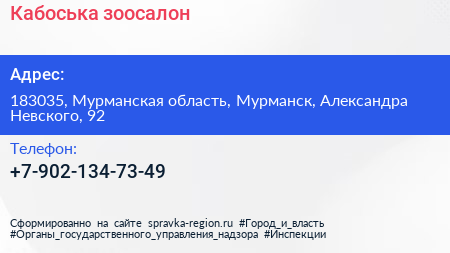 Кабоська, зоосалон по адресу 183035, Мурманская область, Мурманск, Александра Невского, 92 в дальнейшем Организация, размещена в следующих категориях: