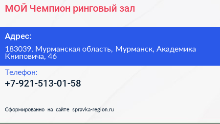 МОЙ Чемпион, ринговый зал по адресу 183039, Мурманская область, Мурманск, Академика Книповича, 46 в дальнейшем Организация, размещена в следующих категориях: