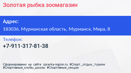 Золотая рыбка, зоомагазин по адресу 183036, Мурманская область, Мурманск, Мира, 8 в дальнейшем Организация, размещена в следующих категориях: