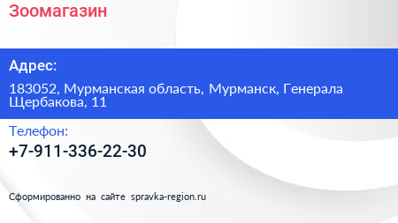 Зоомагазин по адресу 183052, Мурманская область, Мурманск, Генерала Щербакова, 11 в дальнейшем Организация, размещена в следующих категориях: