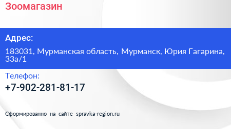 Зоомагазин по адресу 183031, Мурманская область, Мурманск, Юрия Гагарина, 33а/1 в дальнейшем Организация, размещена в следующих категориях: