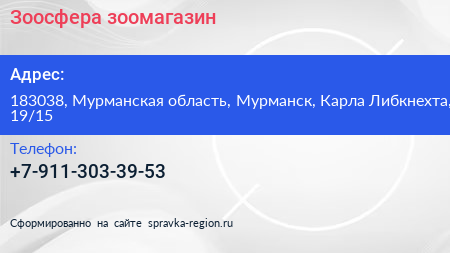Зоосфера, зоомагазин по адресу 183038, Мурманская область, Мурманск, Карла Либкнехта, 19/15 в дальнейшем Организация, размещена в следующих категориях: