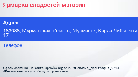 Ярмарка сладостей, магазин по адресу 183038, Мурманская область, Мурманск, Карла Либкнехта, 17 в дальнейшем Организация, размещена в следующих категориях: