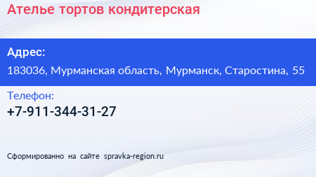 Ателье тортов, кондитерская по адресу 183036, Мурманская область, Мурманск, Старостина, 55 в дальнейшем Организация, размещена в следующих категориях: