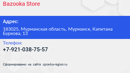 Bazooka Store по адресу 183025, Мурманская область, Мурманск, Капитана Буркова, 13 в дальнейшем Организация, размещена в следующих категориях: