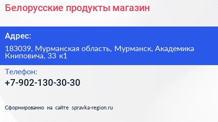 Белорусские продукты, магазин по адресу 183039, Мурманская область, Мурманск, Академика Книповича, 33 к1 в дальнейшем Организация, размещена в следующих категориях: