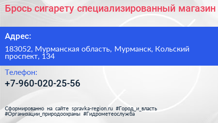 Брось сигарету, специализированный магазин по адресу 183052, Мурманская область, Мурманск, Кольский проспект, 134 в дальнейшем Организация, размещена в следующих категориях: