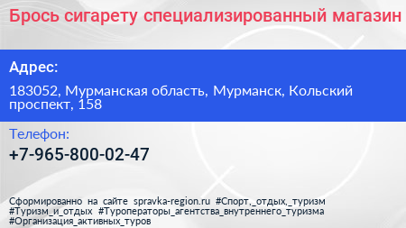 Брось сигарету, специализированный магазин по адресу 183052, Мурманская область, Мурманск, Кольский проспект, 158 в дальнейшем Организация, размещена в следующих категориях:
