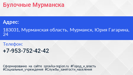 Булочные Мурманска по адресу 183031, Мурманская область, Мурманск, Юрия Гагарина, 24 в дальнейшем Организация, размещена в следующих категориях: