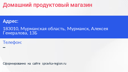 Домашний, продуктовый магазин по адресу 183010, Мурманская область, Мурманск, Алексея Генералова, 13Б в дальнейшем Организация, размещена в следующих категориях: