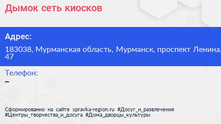 Дымок, сеть киосков по адресу 183038, Мурманская область, Мурманск, проспект Ленина, 47 в дальнейшем Организация, размещена в следующих категориях: