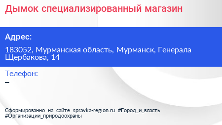 Дымок, специализированный магазин по адресу 183052, Мурманская область, Мурманск, Генерала Щербакова, 14 в дальнейшем Организация, размещена в следующих категориях: