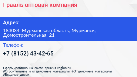 Грааль, оптовая компания по адресу 183034, Мурманская область, Мурманск, Домостроительная, 21 в дальнейшем Организация, размещена в следующих категориях: