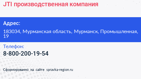 JTI, производственная компания по адресу 183034, Мурманская область, Мурманск, Промышленная, 19 в дальнейшем Организация, размещена в следующих категориях: