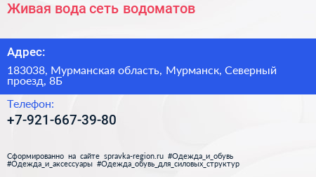 Живая вода, сеть водоматов по адресу 183038, Мурманская область, Мурманск, Северный проезд, 8Б в дальнейшем Организация, размещена в следующих категориях: