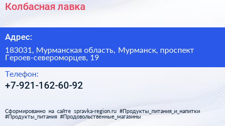 Колбасная лавка по адресу 183031, Мурманская область, Мурманск, проспект Героев-североморцев, 19 в дальнейшем Организация, размещена в следующих категориях: