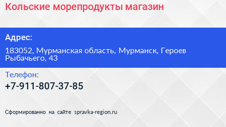 Кольские морепродукты, магазин по адресу 183052, Мурманская область, Мурманск, Героев Рыбачьего, 43 в дальнейшем Организация, размещена в следующих категориях: