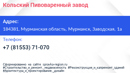Кольский Пивоваренный завод по адресу 184381, Мурманская область, Мурманск, Заводская, 1а в дальнейшем Организация, размещена в следующих категориях: