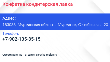 Конфетка, кондитерская лавка по адресу 183038, Мурманская область, Мурманск, Октябрьская, 20 в дальнейшем Организация, размещена в следующих категориях: