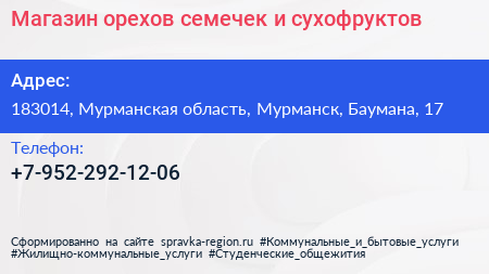 Магазин орехов, семечек и сухофруктов по адресу 183014, Мурманская область, Мурманск, Баумана, 17 в дальнейшем Организация, размещена в следующих категориях: