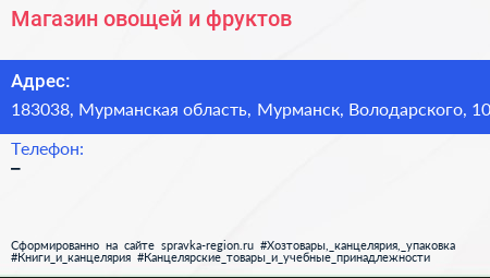 Магазин овощей и фруктов по адресу 183038, Мурманская область, Мурманск, Володарского, 10 в дальнейшем Организация, размещена в следующих категориях: