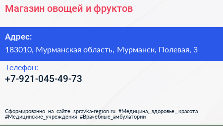 Магазин овощей и фруктов по адресу 183010, Мурманская область, Мурманск, Полевая, 3 в дальнейшем Организация, размещена в следующих категориях: