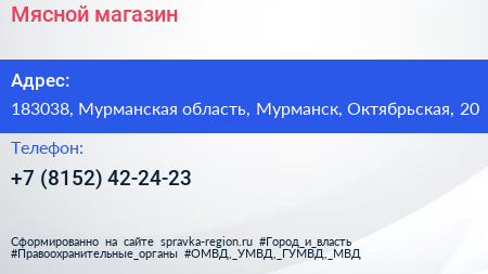 Мясной магазин по адресу 183038, Мурманская область, Мурманск, Октябрьская, 20 в дальнейшем Организация, размещена в следующих категориях: