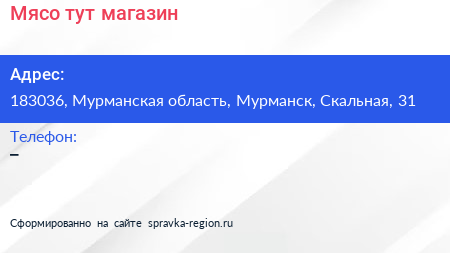 Мясо тут, магазин по адресу 183036, Мурманская область, Мурманск, Скальная, 31 в дальнейшем Организация, размещена в следующих категориях: