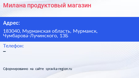 Милана, продуктовый магазин по адресу 183040, Мурманская область, Мурманск, Чумбарова-Лучинского, 13Б в дальнейшем Организация, размещена в следующих категориях: