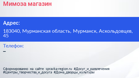 Мимоза, магазин по адресу 183040, Мурманская область, Мурманск, Аскольдовцев, 45 в дальнейшем Организация, размещена в следующих категориях: