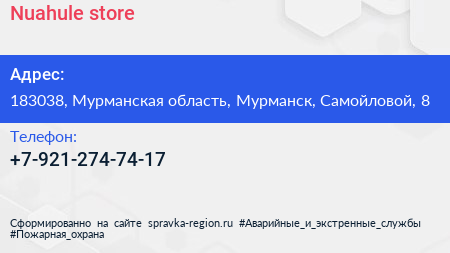 Nuahule store по адресу 183038, Мурманская область, Мурманск, Самойловой, 8 в дальнейшем Организация, размещена в следующих категориях: