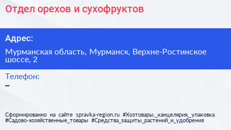 Отдел орехов и сухофруктов по адресу Мурманская область, Мурманск, Верхне-Ростинское шоссе, 2 в дальнейшем Организация, размещена в следующих категориях: