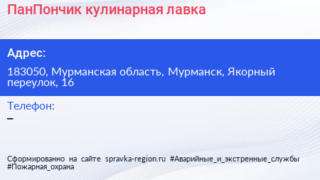 ПанПончик, кулинарная лавка по адресу 183050, Мурманская область, Мурманск, Якорный переулок, 16 в дальнейшем Организация, размещена в следующих категориях: