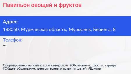 Павильон овощей и фруктов по адресу 183050, Мурманская область, Мурманск, Беринга, 8 в дальнейшем Организация, размещена в следующих категориях: