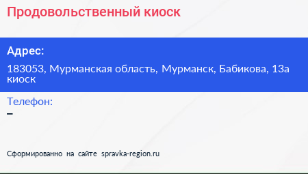 Продовольственный киоск по адресу 183053, Мурманская область, Мурманск, Бабикова, 13а киоск в дальнейшем Организация, размещена в следующих категориях: