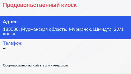 Продовольственный киоск по адресу 183038, Мурманская область, Мурманск, Шмидта, 29/1 киоск в дальнейшем Организация, размещена в следующих категориях: