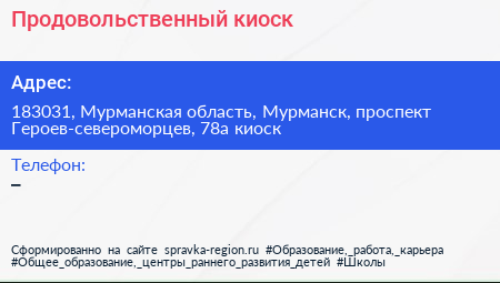 Продовольственный киоск по адресу 183031, Мурманская область, Мурманск, проспект Героев-североморцев, 78а киоск в дальнейшем Организация, размещена в следующих категориях: