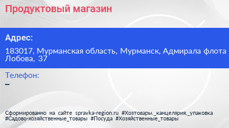 Продуктовый магазин по адресу 183017, Мурманская область, Мурманск, Адмирала флота Лобова, 37 в дальнейшем Организация, размещена в следующих категориях:
