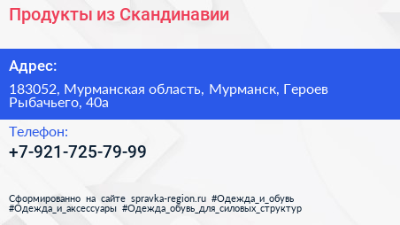 Продукты из Скандинавии по адресу 183052, Мурманская область, Мурманск, Героев Рыбачьего, 40а в дальнейшем Организация, размещена в следующих категориях: