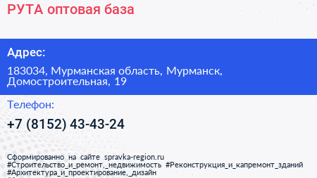 РУТА, оптовая база по адресу 183034, Мурманская область, Мурманск, Домостроительная, 19 в дальнейшем Организация, размещена в следующих категориях: