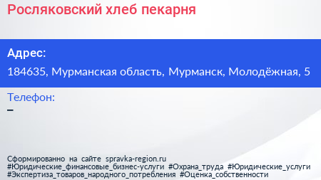 Росляковский хлеб, пекарня по адресу 184635, Мурманская область, Мурманск, Молодёжная, 5 в дальнейшем Организация, размещена в следующих категориях: