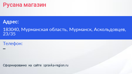 Русана, магазин по адресу 183040, Мурманская область, Мурманск, Аскольдовцев, 23/35 в дальнейшем Организация, размещена в следующих категориях: