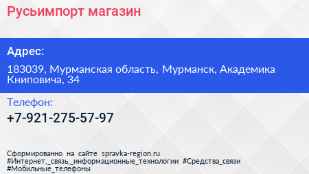 Русьимпорт, магазин по адресу 183039, Мурманская область, Мурманск, Академика Книповича, 34 в дальнейшем Организация, размещена в следующих категориях: