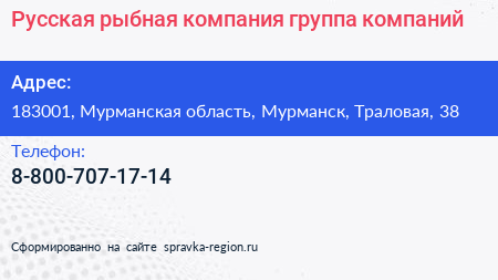 Русская рыбная компания, группа компаний по адресу 183001, Мурманская область, Мурманск, Траловая, 38 в дальнейшем Организация, размещена в следующих категориях: