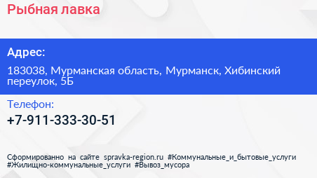 Рыбная лавка по адресу 183038, Мурманская область, Мурманск, Хибинский переулок, 5Б в дальнейшем Организация, размещена в следующих категориях: