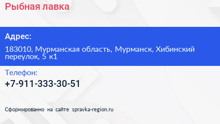 Рыбная лавка по адресу 183010, Мурманская область, Мурманск, Хибинский переулок, 5 к1 в дальнейшем Организация, размещена в следующих категориях: